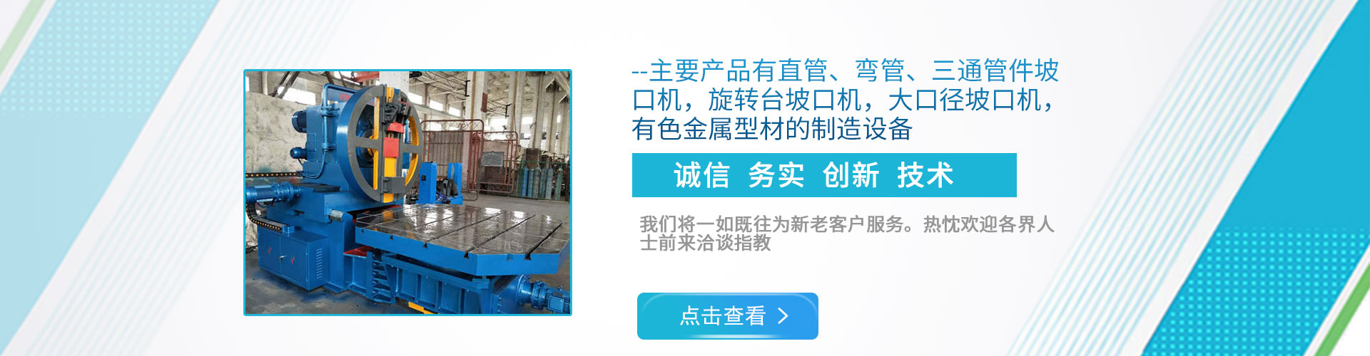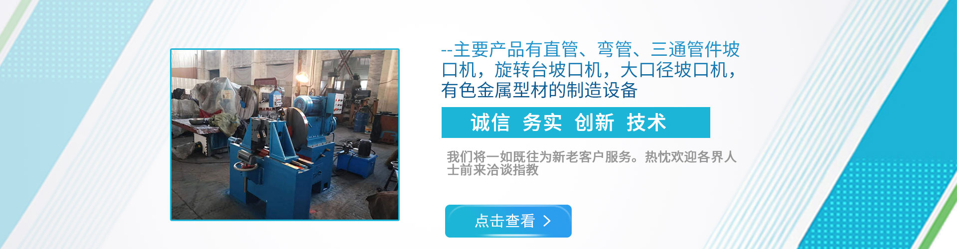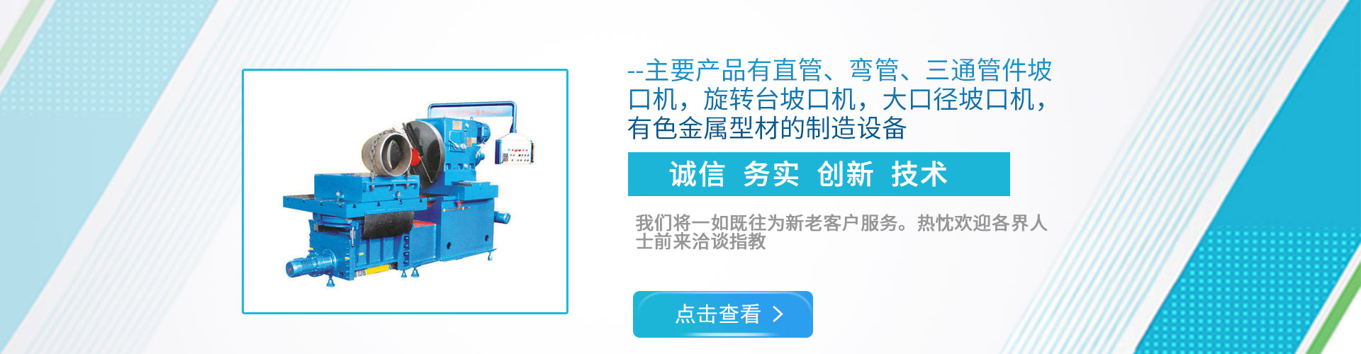 公司現(xiàn)下轄兩個(gè)分廠(chǎng),一分廠(chǎng)主營(yíng)電動(dòng)管道坡口機(jī)和焊接設(shè)備,適用于造船、電力工程安裝、石油、化工、鍋爐廠(chǎng)、冶金以及鋼鐵行業(yè); 二分廠(chǎng)主營(yíng)雙頭坡口機(jī),600mm直管坡口機(jī)和金屬型材擠壓生產(chǎn)線(xiàn),適用于銅、鋁、鎂、鉛、鋅等有色金屬及其合金的加工。